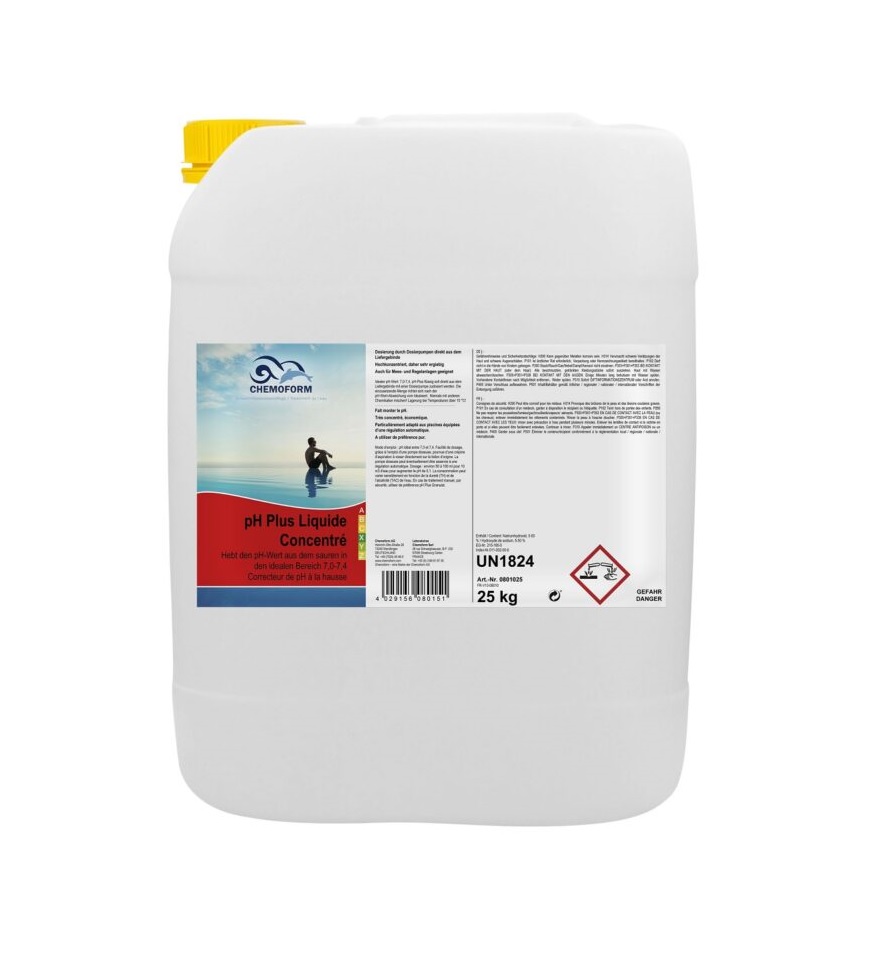 Жидкий препарат на основе гидроксида натрия для повышения уровня рН воды в бассейне при помощи контрольно-дозирующего оборудования. Идеальный уровень рН7,0-7,4.